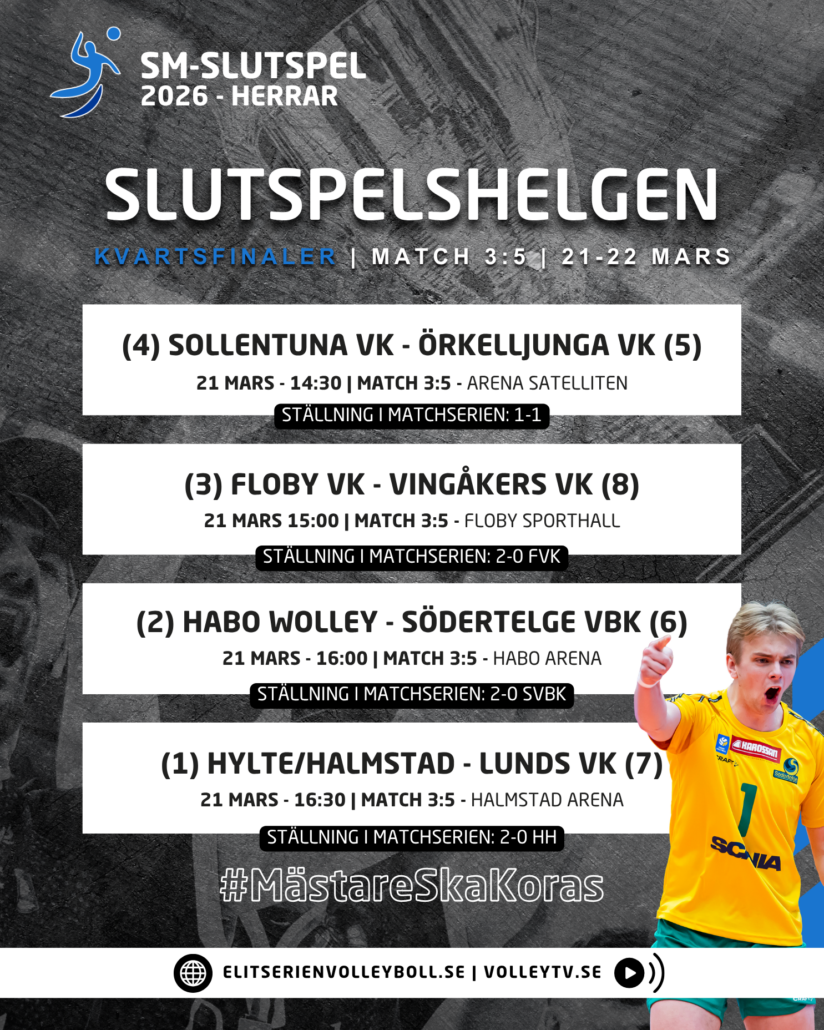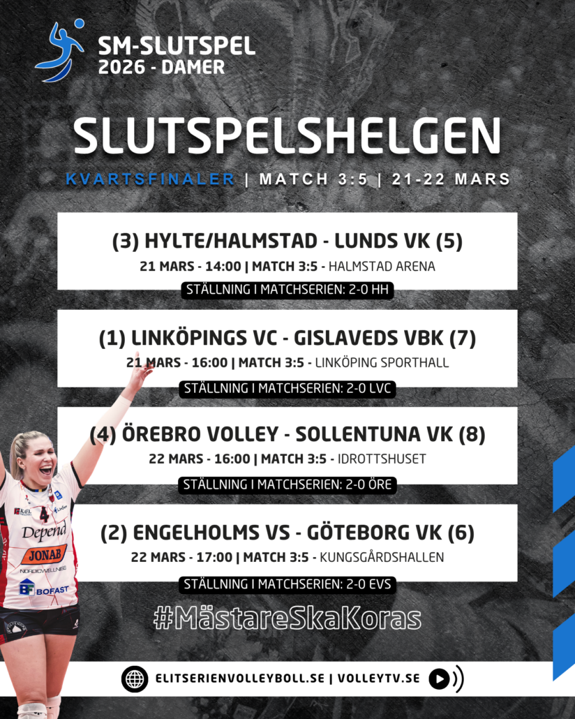 Elitserienvolleyboll.se levererar förutsättningar samt länkar till livesändningar, livescore, spelschema inför den nya slutspelshelgen där hela sju av åtta kvartsfinalserier kan avgöras.